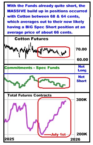 I have been pointing out that Cotton routinely seems to make 30-50 cent swings every few years, and that, after being dead sideways in a 6-7 cent range for the past year, and with Speculative Funds having a massive short position, I THINK COTTON IS FLATASS READY TO GO ON THE UPSIDE…And what follows may seem like gobbledygook but if you wade through each step below I think you will be able to understand why I am so IMMEDIATELY BULLISH…